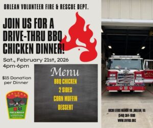 Orlean Volunteer Fire & Rescue Department will host a BBQ Chicken Drive-Thru Dinner on Saturday, February 21, 2026, from 4:00–6:00 PM.